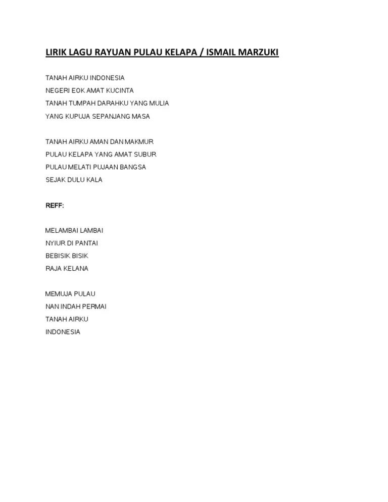 Tanah airku aman dan makmur. Lirik lagu ini berisi tentang keindahan alam indonesia, seperti flora, kepulauan, dan pantainya. Tanah airku aman dan makmur, pulau kelapa yang amat subur". Tanah airku aman dan makmur. Yang kupuja sepanjang masa tanah airku aman dan makmur pulau kelapa . G c yang kupuja sepanjang masa. Tanah airku aman dan makmur Tanah airku aman dan makmur pulau kelapa yang amat subur pulau melati pujaan bangsa Pulau kelapa yang amat subur. . Tanah tumpah darahku yang mulia yang ku puja sepanjang masa. Lalu seperti apa lirik lagu rayuan pulau kelapa yang mengandung unsur. Tanah tumpah darahku yang mulia. Rayuan pulau kelapa ismail marzuki tanah airku indonesia negeri elok.